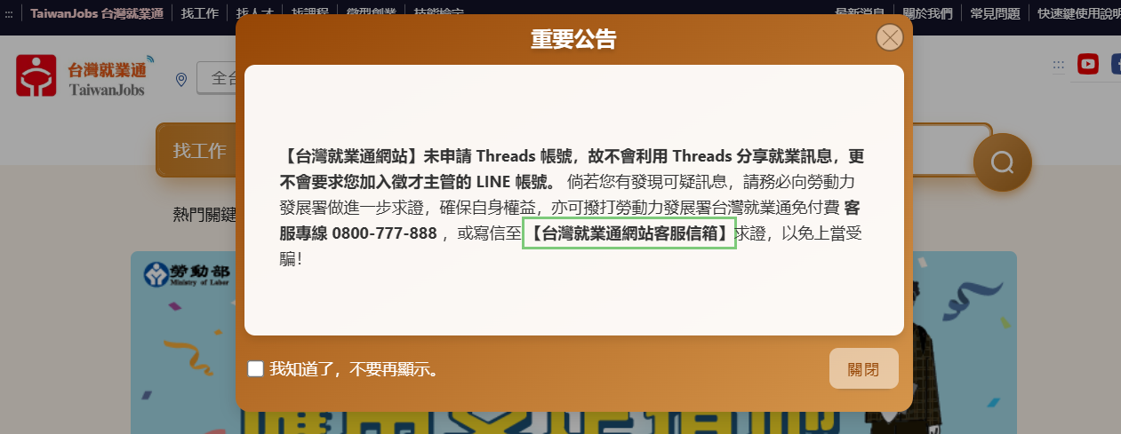 有關勞動部勞動力發展署(下稱發展署)轉知台灣就業通品牌名稱遭冒用一案,請協助公告周知並宣導,請查照。