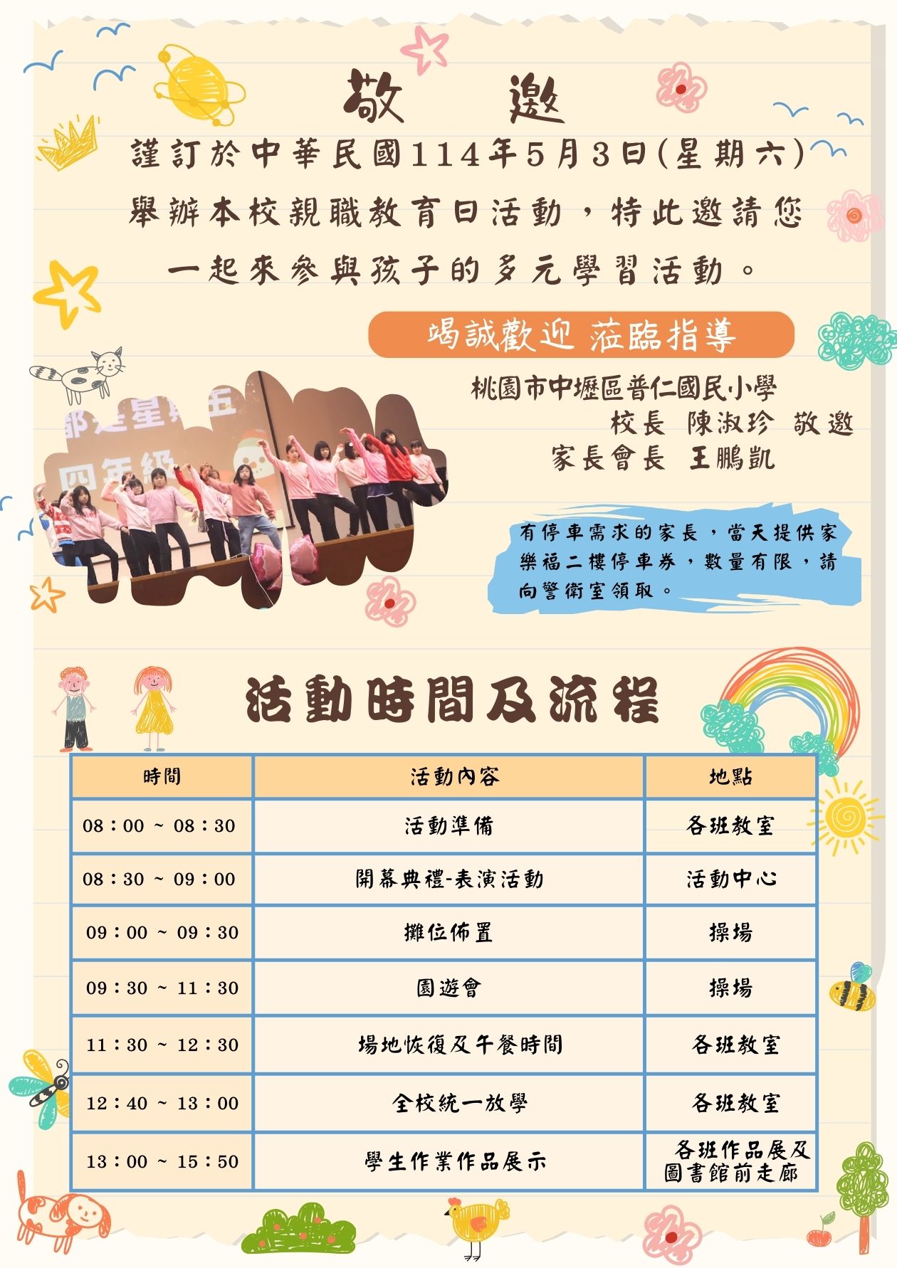 謹訂於114年5月3日(星期六)上午8時30分,於本校活動中心舉辦親職教育日暨園遊會,敬邀各界貴賓蒞臨指導。