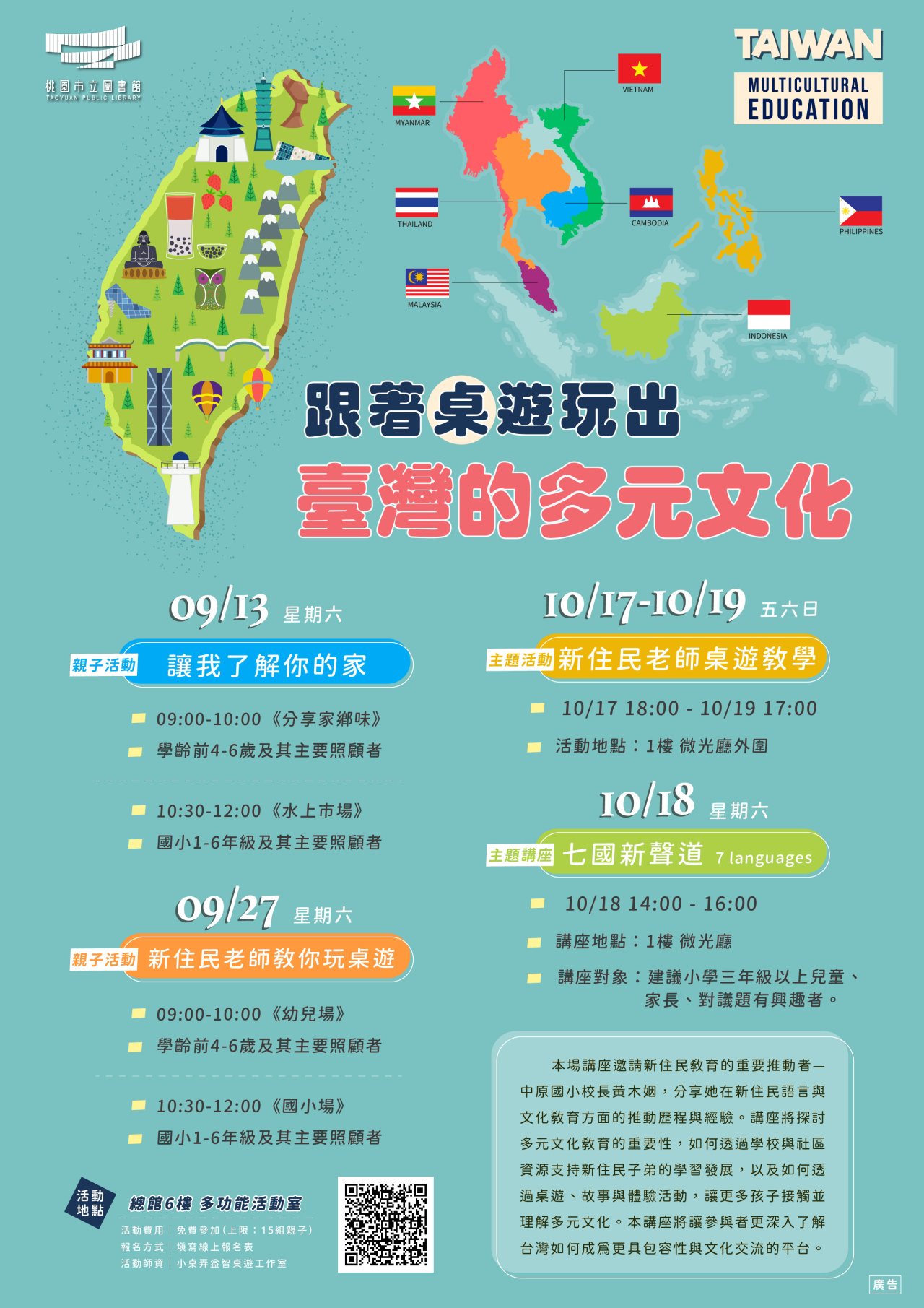 一、 | 臺灣是多元文化的匯聚地,來自不同國家的新住民豐富了我們的語言、飲食與傳統習俗。旨揭活動透過主題講座、親子桌遊推廣課程與文化體驗攤位,讓大人與孩子在遊戲中學習,感受來自東南亞的文化魅力,並探索台灣如何成為文化交融的美好家園。 |