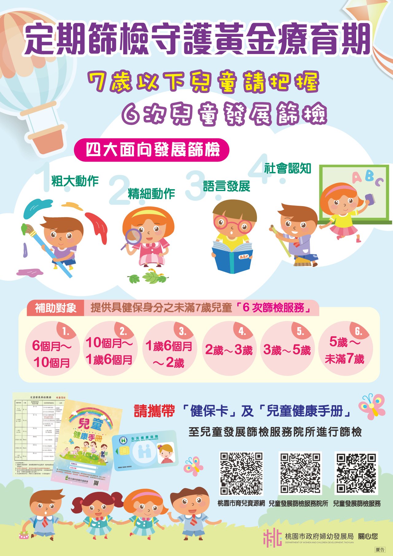 | 四、 | 本案兒童發展篩檢相關資訊可至桃園市政府婦幼發展局官網https://dowcd.tycg.gov.tw/News_Content.aspx?n=16982&s=1323191查詢,如有疑問可洽詢本局承辦人員朱小姐,電話03-3322101轉分機5906。 |