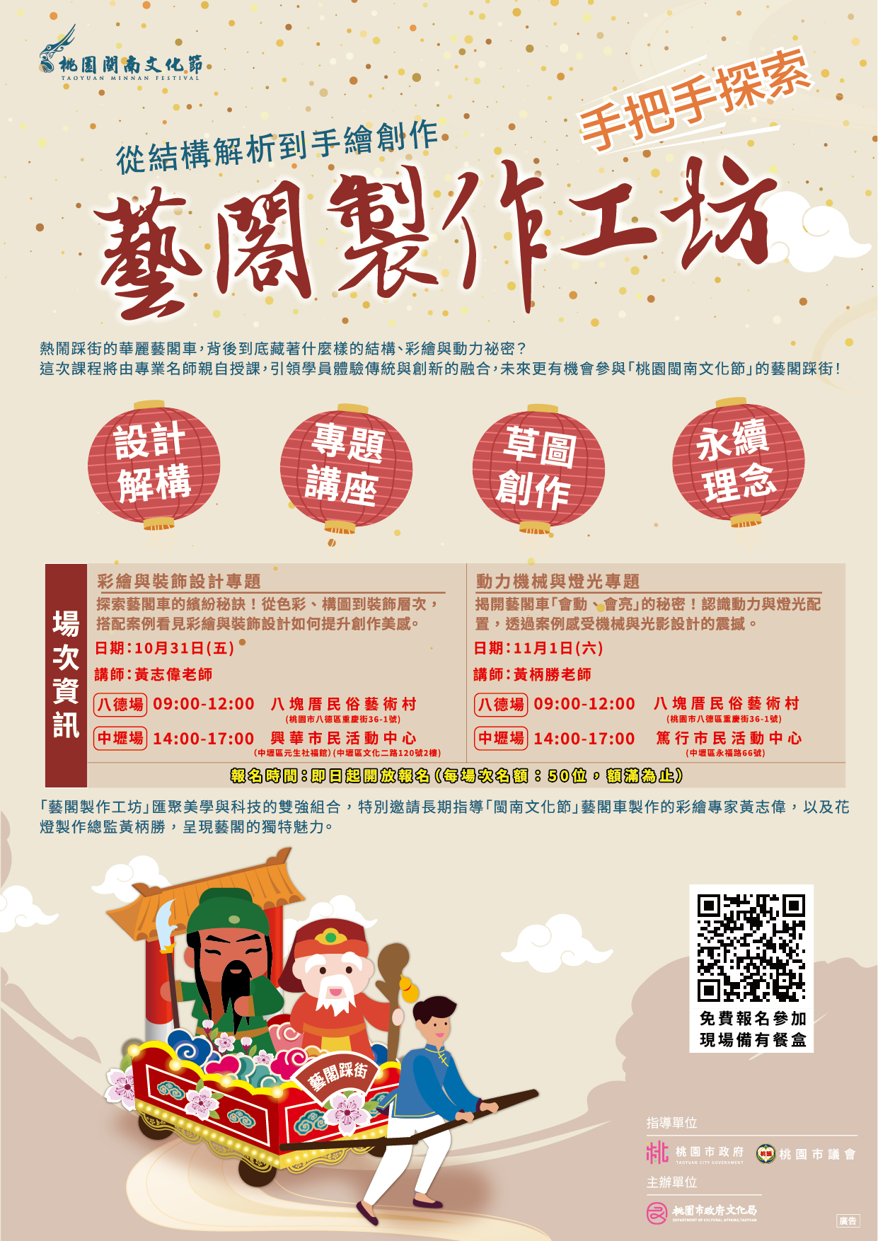 檢送本局2026桃園閩南文化節「藝閣踩街共創行動」徵件簡章,及「藝閣製作工坊」文宣資料,敬請惠予公告,並鼓勵貴校師生踴躍報名參加,請查照。